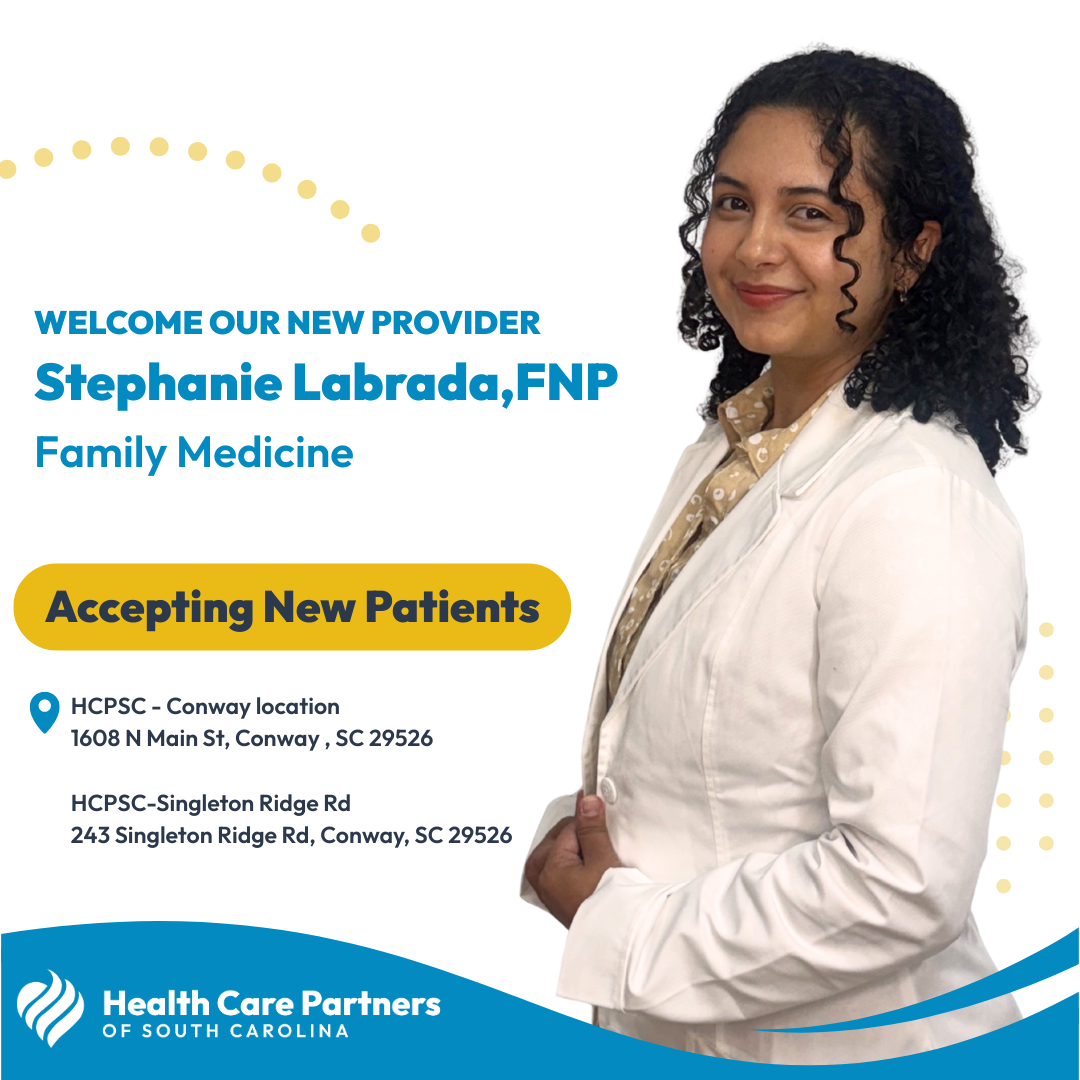 Health Care Partners of South Carolina is proud to introduce Stephanie Labrada, FNP-C, a compassionate and bilingual Family Nurse Practitioner providing exceptional care at both our Conway and Singleton Ridge locations. Fluent in English and Spanish, Stephanie embodies our mission of delivering Health with Heart by ensuring every patient feels heard, valued, and cared for.